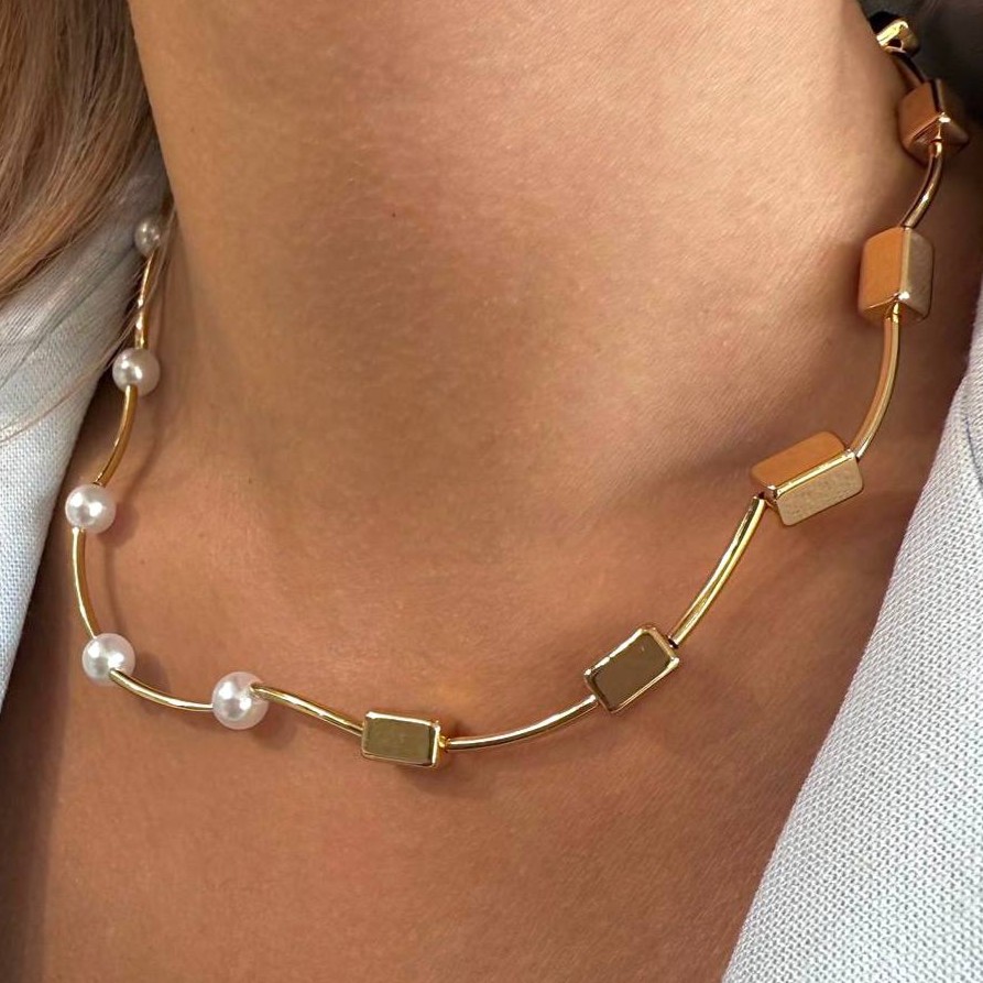 گردنبند طلایی با مروارید و مهرههای هندسیناموجود