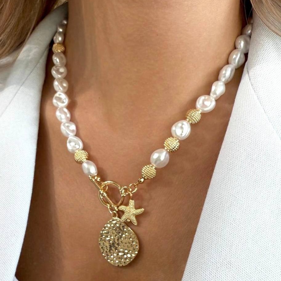 گردنبند مرواریدی با آویز ستاره دریایی و بیضی طلاییناموجود