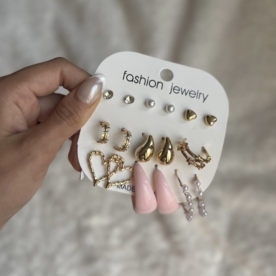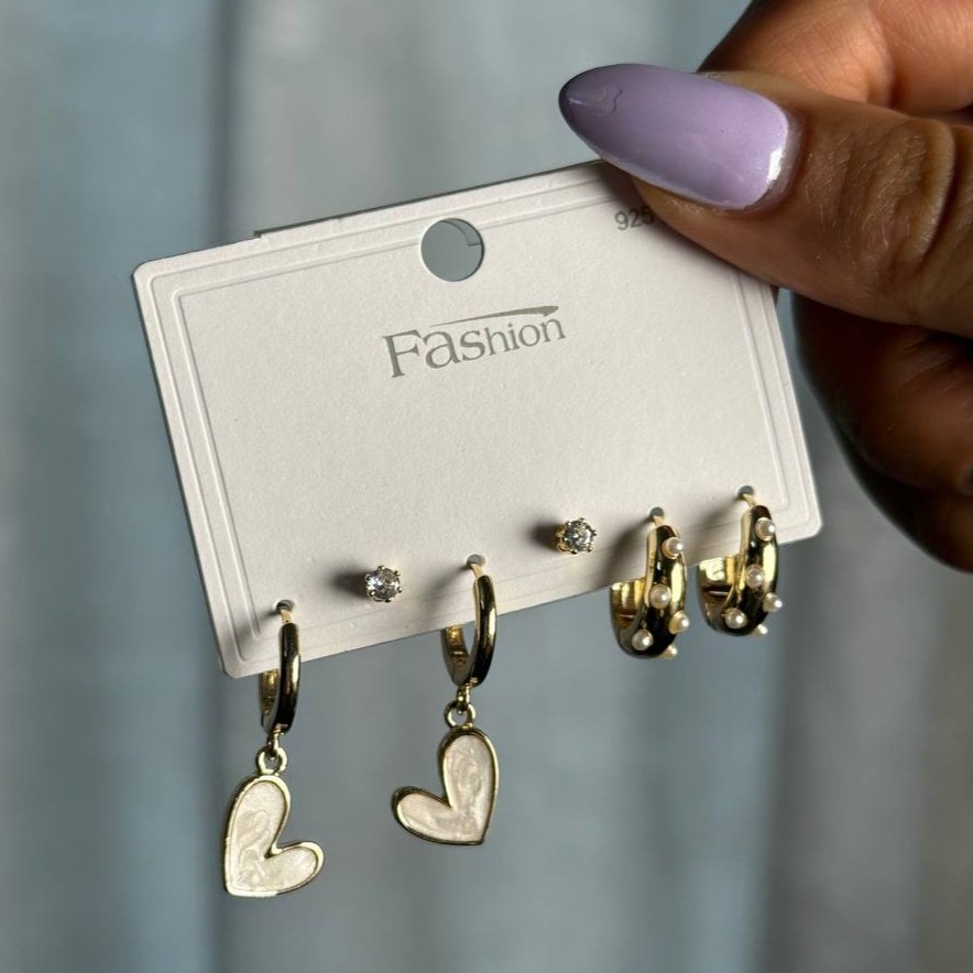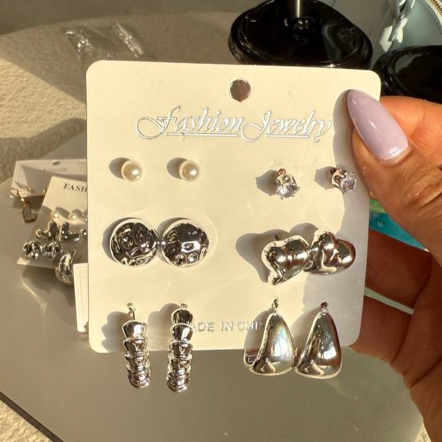 ست 6 جفت گوشواره نقره ای قلب و مروارید و نگین و حلقه ایناموجود