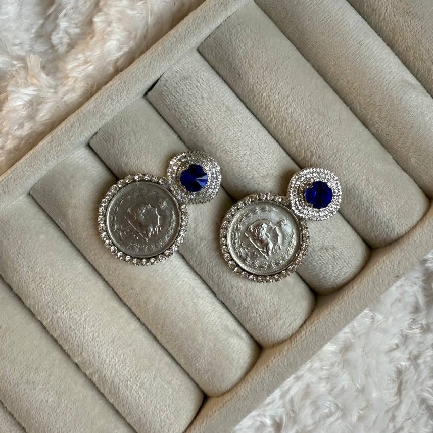 گوشواره سکه ای نقره ای با نگین آبیناموجود