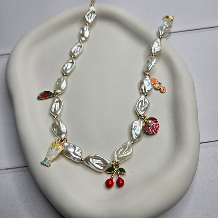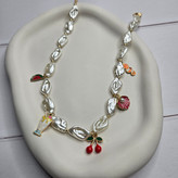 این گردنبند خاص با مهرههای مرواریدی براق و آویزهای رنگارنگ و جذاب، مناسب برای عاشقان استایلهای شاد، فانتزی و تابستانی است.