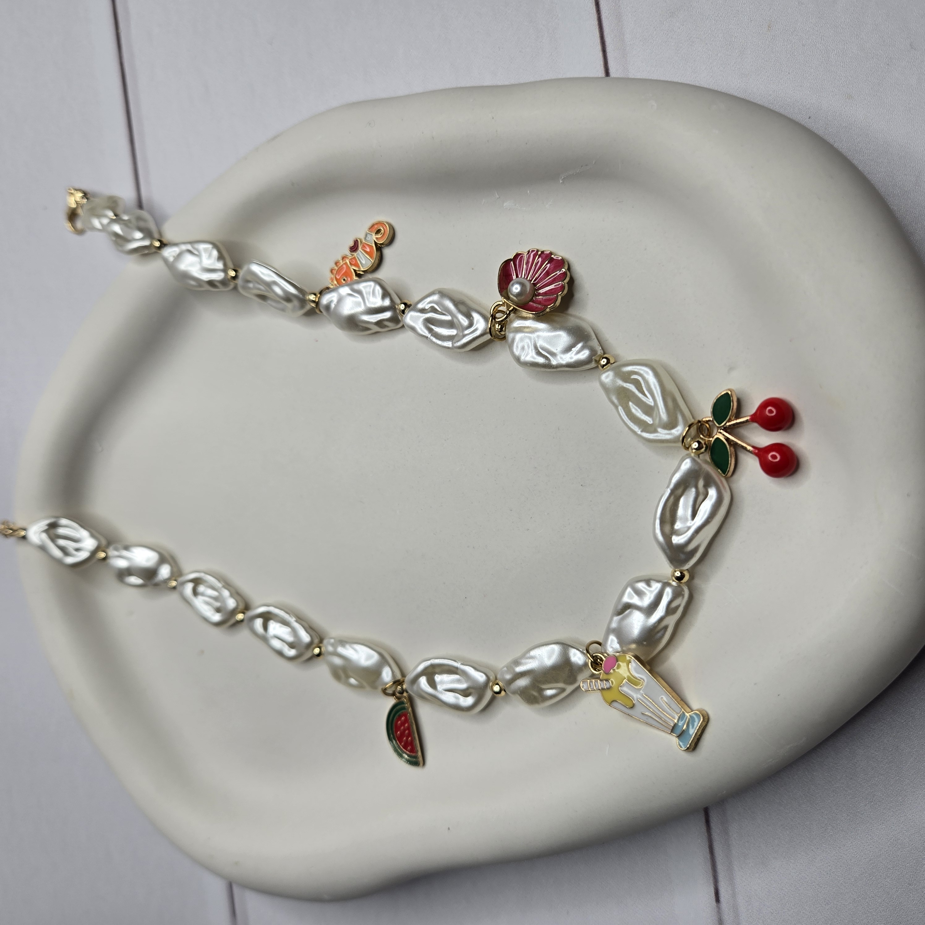 این گردنبند خاص با مهرههای مرواریدی براق و آویزهای رنگارنگ و جذاب، مناسب برای عاشقان استایلهای شاد، فانتزی و تابستانی است.