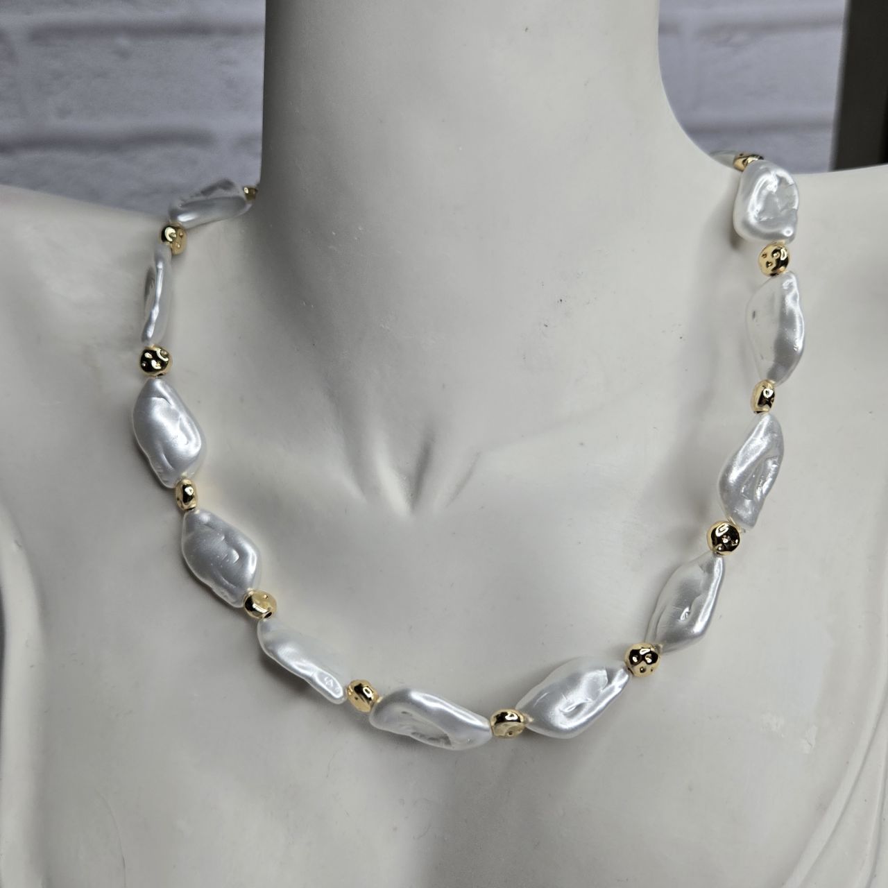 گردنبند زنانه باروک گوی طلایی تلفیقی از سبک کلاسیک و طراحی مدرن است. مهرههای باروک نامنظم با بافت طبیعی و گوی طلایی درخشان در مرکز این گردنبند، ترکیبی چشمنواز و لوکس بهوجود آورده که کاملاً مناسب استایلهای خاص، مجلسی، و حتی بوهو و هنری است.