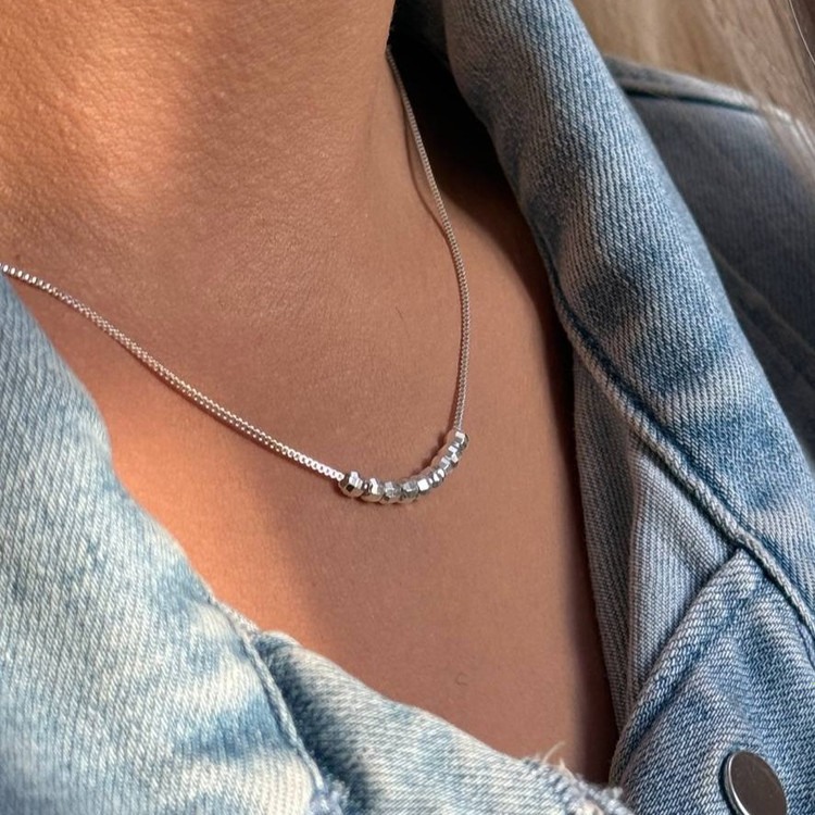 گردنبند آبکاری نقرهای با مهرههای مکعبی براق، طراحی ساده اما شیک دارد که بهراحتی با هر استایلی ست میشود 💫. سبک، ظریف و مناسب استفاده روزانه و مهمانیهاست.