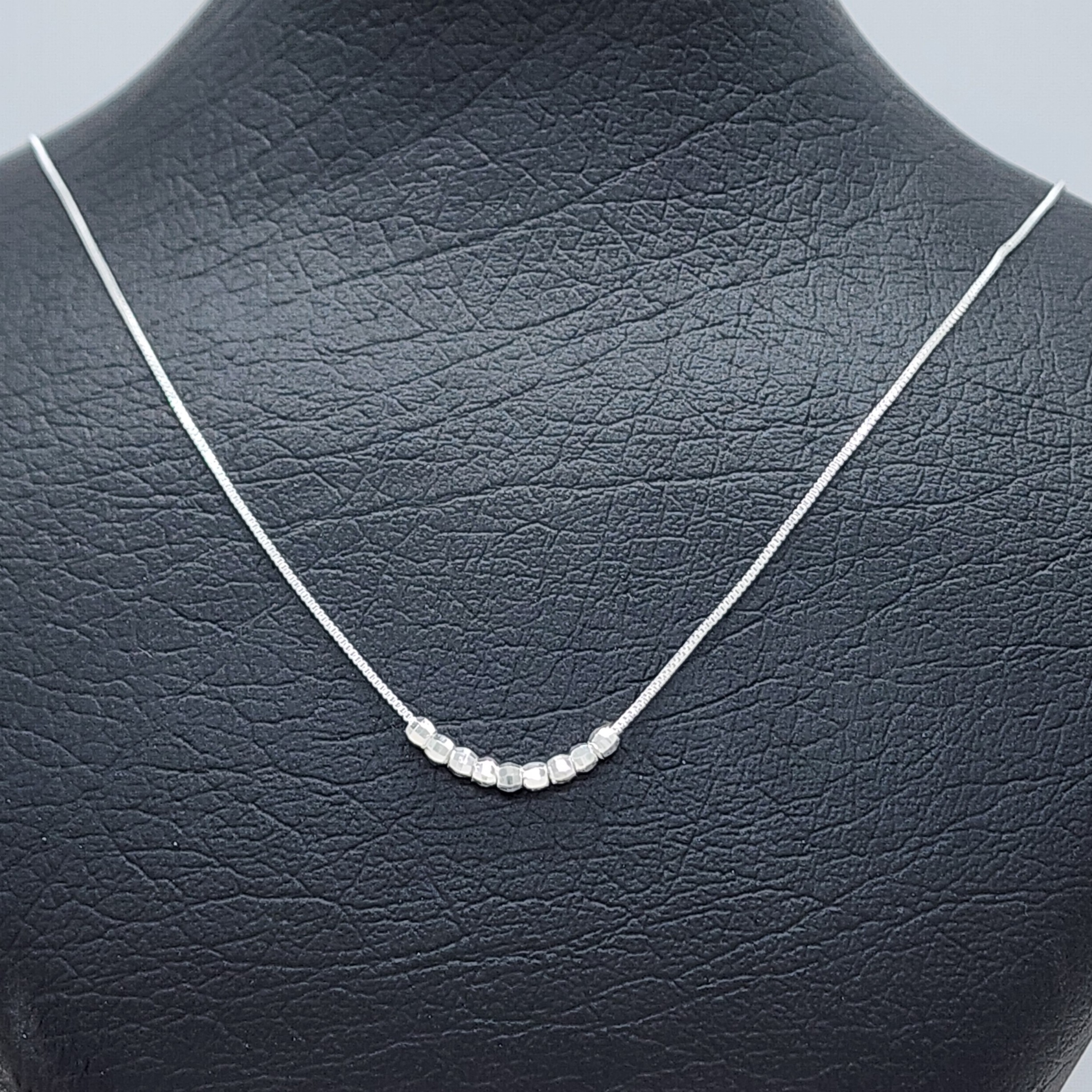 گردنبند آبکاری نقرهای با مهرههای مکعبی براق، طراحی ساده اما شیک دارد که بهراحتی با هر استایلی ست میشود 💫. سبک، ظریف و مناسب استفاده روزانه و مهمانیهاست.
