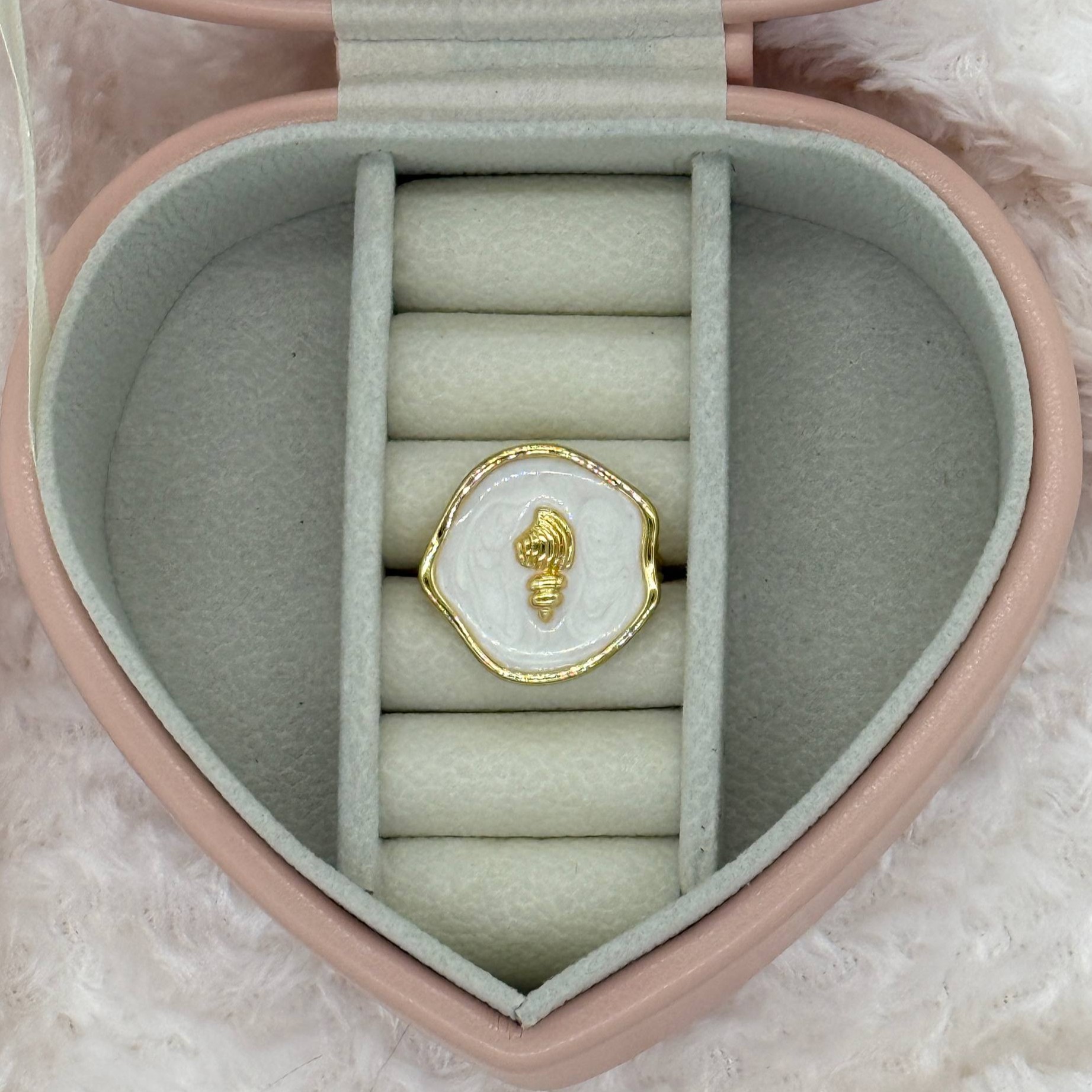 این انگشتر خاص با سنگ سفید نامنظم و قاب طلایی، جلوهای طبیعی و هنری دارد. طرح صدف طلایی در مرکز سنگ، حس ساحلی و آرامشبخش را منتقل میکند و آن را به انتخابی عالی برای استایلهای تابستانی و خاص تبدیل کرده است.