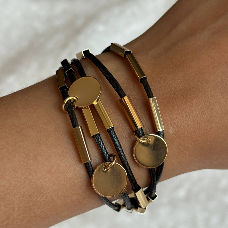 این دستبند چند رشتهای با بندهای چرمی مشکی و پولکهای طلایی، انتخابی بینظیر برای کسانیست که به دنبال استایلی خاص، مدرن و متفاوت هستند.