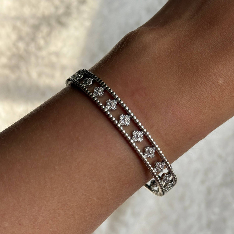 این بنگل فلزی با طراحی منحصربهفرد و تراشهای براق نگینمانند، جلوهای لوکس و خیرهکننده دارد. سطح بنگل با اشکال الماسمانند کوچک تزئین شده که با چینش منظم و تراشهای دقیق، نور را به زیبایی منعکس میکنند و جلوهای درخشان به مچ دست شما میبخشند.