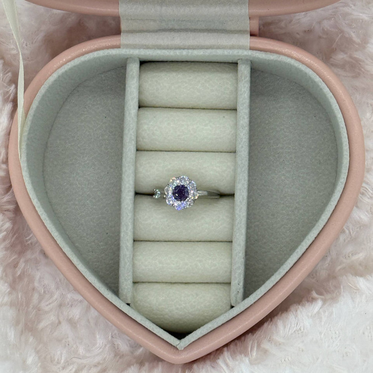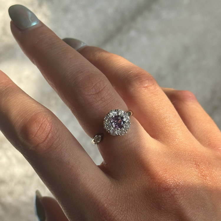 این انگشتر با طراحی مینیمال و نگین چرخان در مرکز، انتخابی خاص برای کسانیست که به جزئیات اهمیت میدهند. فرم دایرهای و رنگ نقرهای مات، جلوهای مدرن و شیک به انگشتر بخشیده. نگین بنفش درخشان که در قاب سنگهای ریز قرار گرفته، با قابلیت چرخش، حس حرکت و پویایی را به این زیور اضافه میکند.