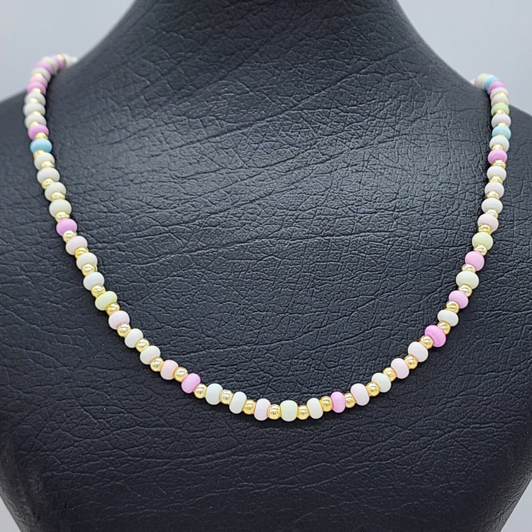 این گردنبند با ترکیب مهرههای پاستلی (صورتی، آبی، بنفش، کرم) در کنار مهرههای طلایی کوچک، یه گزینه عالی برای کساییه که به استایلهای ساده و سرزنده علاقه دارن.