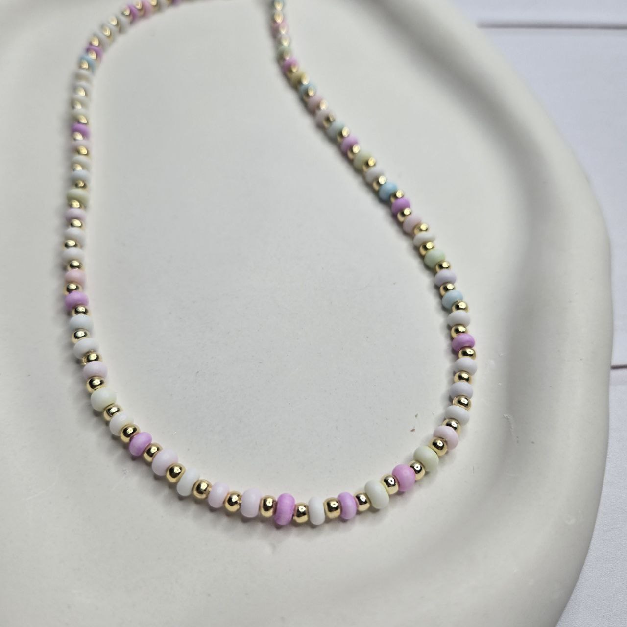 این گردنبند با ترکیب مهرههای پاستلی (صورتی، آبی، بنفش، کرم) در کنار مهرههای طلایی کوچک، یه گزینه عالی برای کساییه که به استایلهای ساده و سرزنده علاقه دارن.