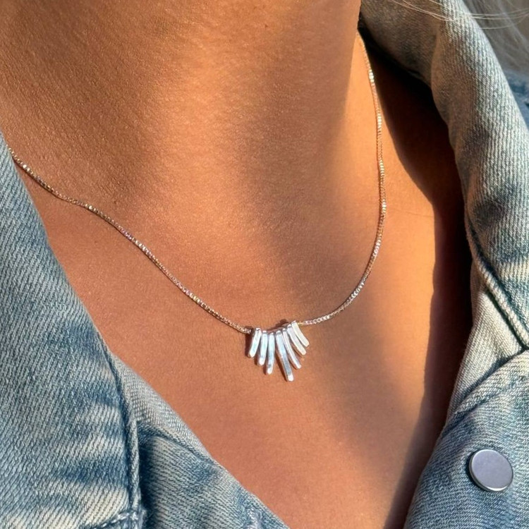 این گردنبند با طراحی خاصِ آویز بارانی، از پنج میلهی براق با چینش نامتقارن ساخته شده که یکی از آنها با نگینهای درخشان تزئین شده. ترکیب این طراحی با آبکاری نقرهای براق، جلوهای مینیمال، مدرن و درخشان به گردن شما میده.