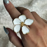 این انگشتر چشمگیر با طراحی گل پنجپر سفید و لبههای طلایی، جلوهای زنانه، لطیف و هنرمندانه داره. مرکز طلایی گل، درخشش خاصی به انگشتر میبخشه و فرم برجستهی آن، انگشت شما رو به نقطهی تمرکز استایل تبدیل میکنه. طراحی بزرگ و خلاقانهی این انگشتر، انتخابی عالی برای کسانیه که جسارت متفاوت بودن رو دارن.
