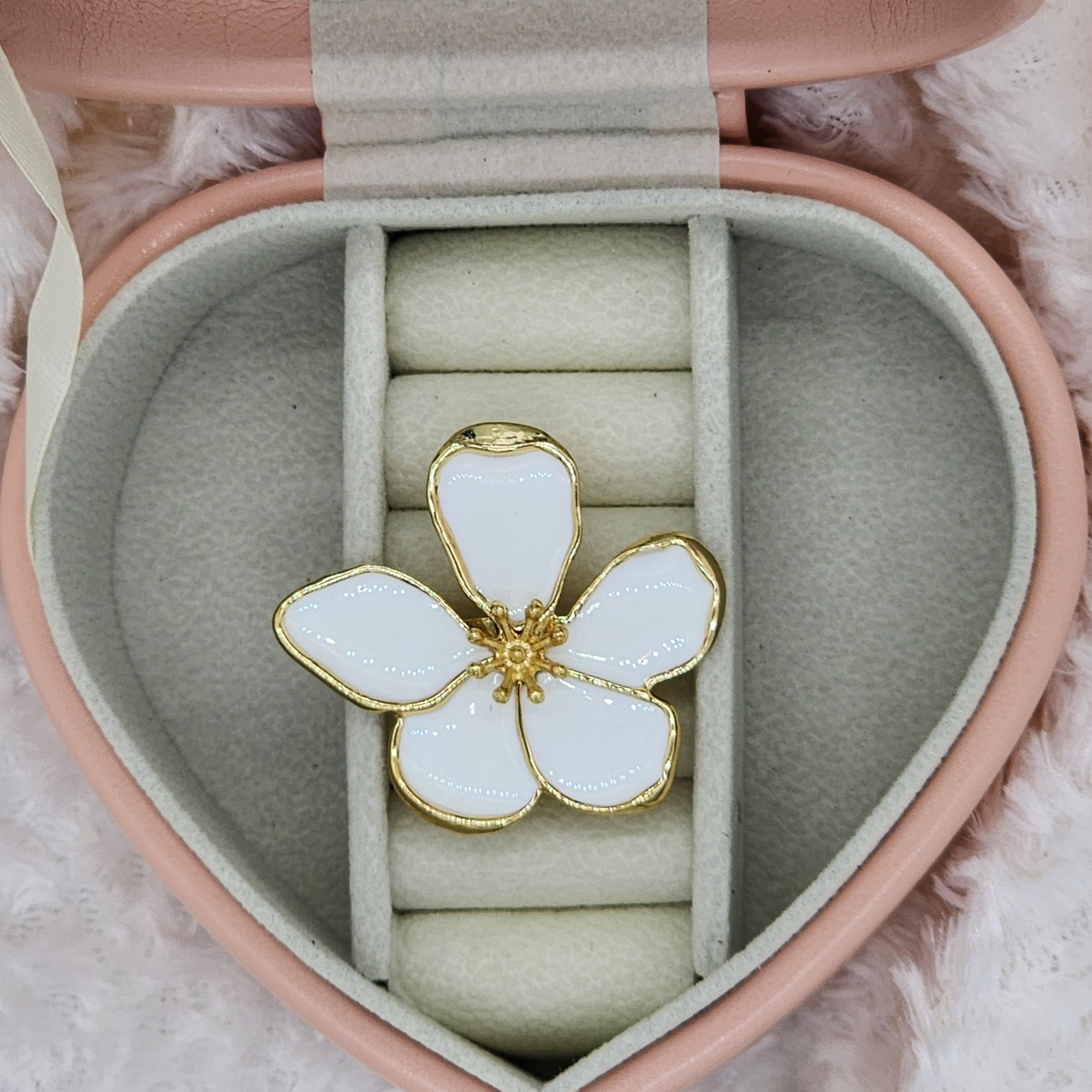 این انگشتر چشمگیر با طراحی گل پنجپر سفید و لبههای طلایی، جلوهای زنانه، لطیف و هنرمندانه داره. مرکز طلایی گل، درخشش خاصی به انگشتر میبخشه و فرم برجستهی آن، انگشت شما رو به نقطهی تمرکز استایل تبدیل میکنه. طراحی بزرگ و خلاقانهی این انگشتر، انتخابی عالی برای کسانیه که جسارت متفاوت بودن رو دارن.