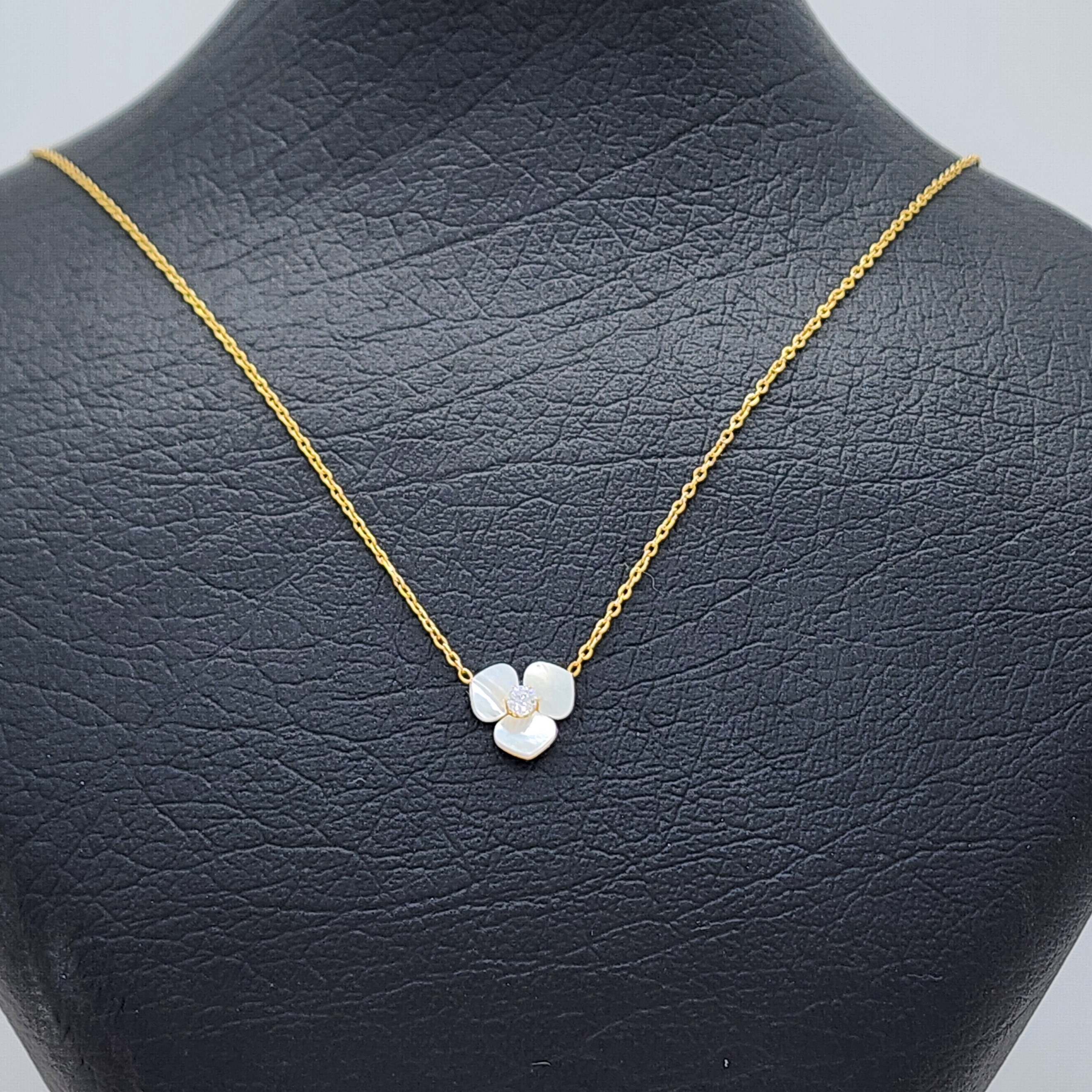 گردنبند ظریف طرح گل با آبکاری طلا و گلبرگهای صدفی براق، جلوهای لطیف و زنانه به استایل شما میبخشد. مرکز گل با نگینی ریز و درخشان 💎 تزیین شده که جذابیت آن را دوچندان میکند. این گردنبند انتخابی ایدهآل برای هدیه به عزیزان یا تکمیل یک استایل رمانتیک است 💛.