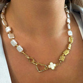 این گردنبند خاص با ترکیب مهرههای سفید نامنظم و مهرههای طلایی مستطیلی، جلوهای لوکس و چشمگیر دارد. قفل قلبی و آویز شبدر چهار برگ طلایی، نهتنها زیبایی بصری ایجاد میکند، بلکه نمادی از عشق، امید و خوششانسی را همراه شما میسازد. طراحی آن مناسب برای استایلهای روزمره و رسمی است و بهراحتی با سایر اکسسوریها ست میشود.