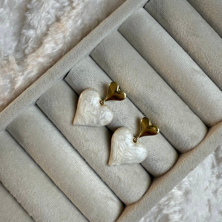 متاسفانه این کالا در حال حاضر موجود نیست. میتوانید از طریق لیست بالای صفحه، از محصولات مشابه این کالا دیدن نمایید.این گوشوارهها شامل دو قلب هستند: یک قلب طلایی براق در بالا و یک قلب سفید با طرح مرمری در پایین. 💛🤍/پشت میخی