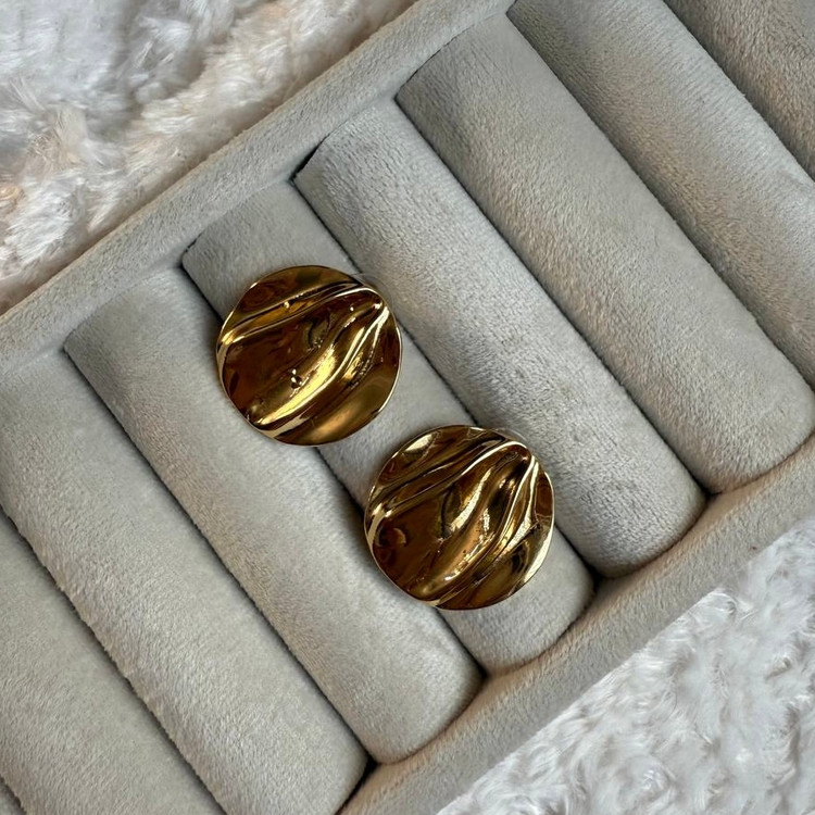 این گوشوارهها طرحی گرد و طلایی دارند با سطحی موجدار و براق که ظاهری مدرن و خاص به آنها میبخشد ✨💛. ظاهر چشمگیر و در عین حال مینیمال، مناسب استایلهای شیک و رسمی است./پشت میخی
