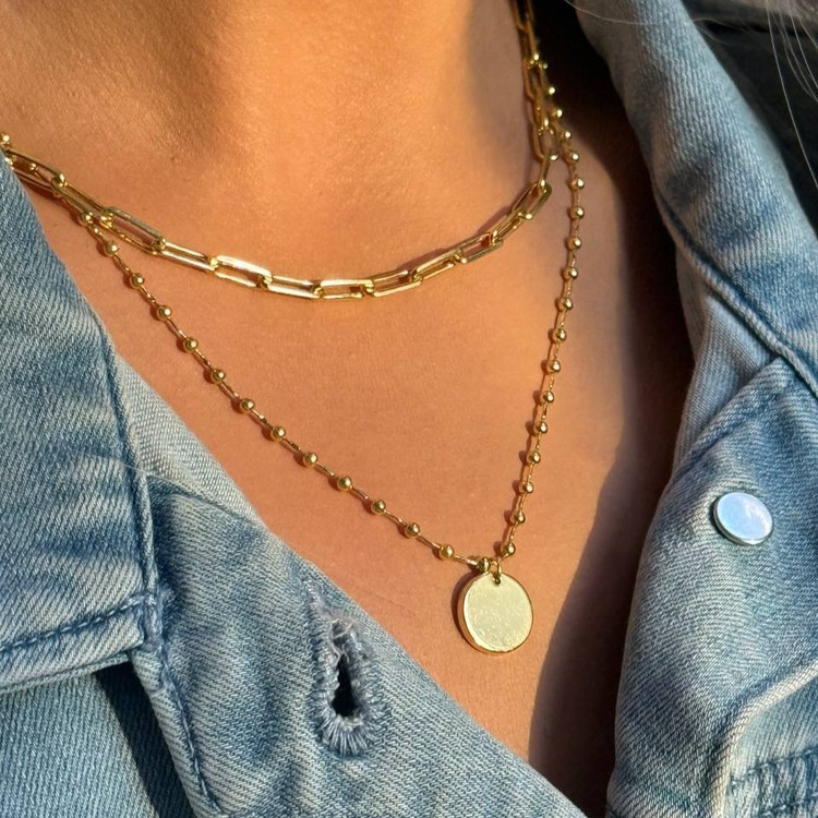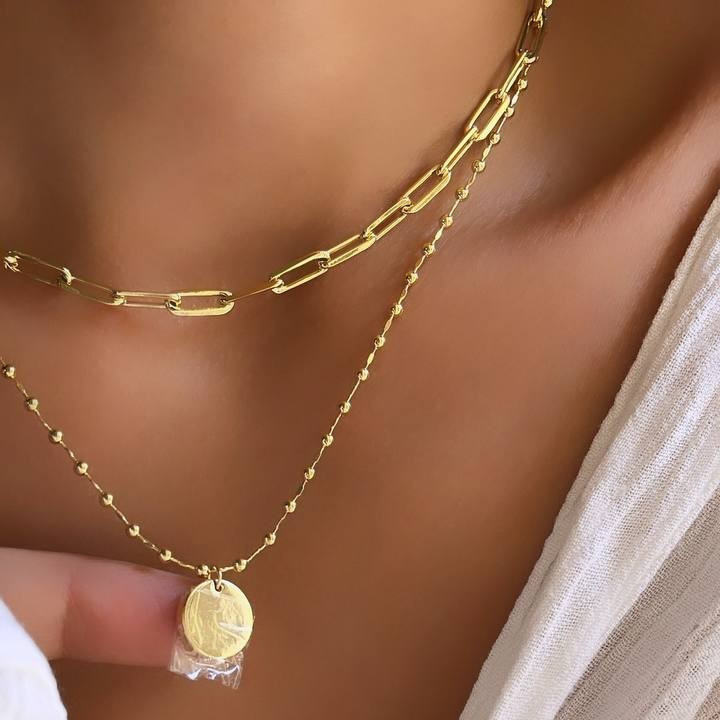 این ست دو تکه شامل یک گردنبند زنجیری با حلقههای مستطیلی و یک گردنبند آویزدار با مهرههای طلایی و پلاک سکهای برجسته است. طراحی لایهای این دو گردنبند، جلوهای خاص و چندبُعدی به استایل شما میبخشه و بهراحتی با لباسهای ساده یا رسمی ست میشه.