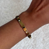 بنگل نگین دار با طراحی مینیمال و درخشش ظریف نگینهای شفاف، انتخابیست برای کسانی که زیبایی را در جزئیات میبینند. فرم بیضیشکل و سطح صیقلی آن با موتیفهای دایرهای و نگینهای ظریف تزئین شده، در حالی که حکاکی برند در بخش داخلی، اصالت طراحی را تأیید میکند.