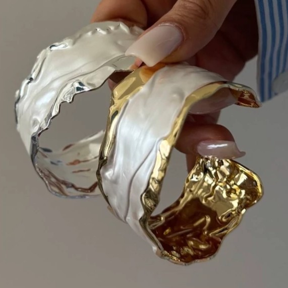 این بنگل منحصربهفرد با طراحی موجدار و ترکیب رنگهای صدفی و طلایی، نمادی از زیبایی طبیعی و هنر مدرن است. مرکز سفید و براق آن با بافت صدفی، در کنار لبههای طلایی، جلوهای چشمنواز و لوکس ایجاد کرده که بهراحتی با انواع استایلها هماهنگ میشود.