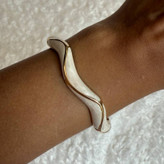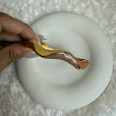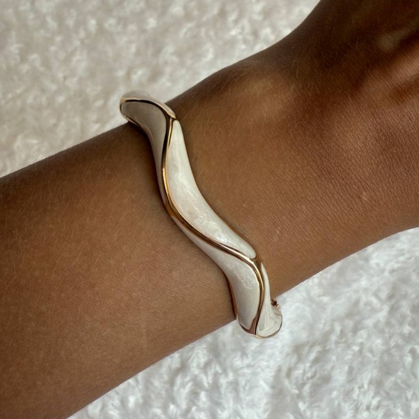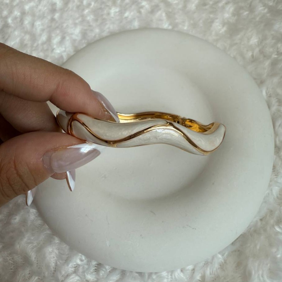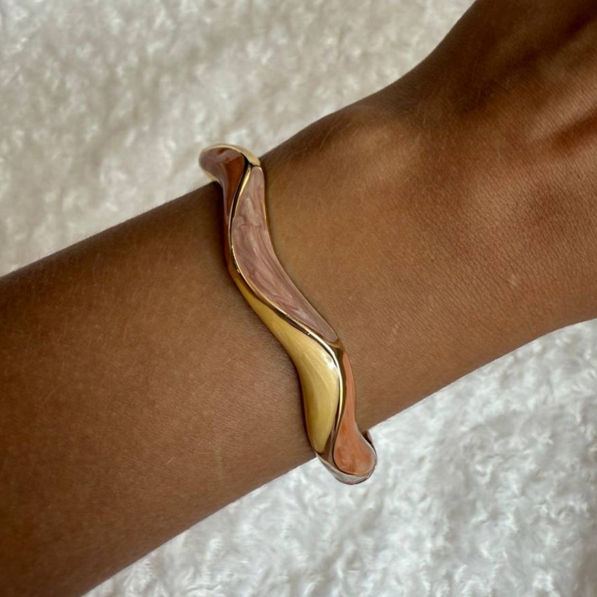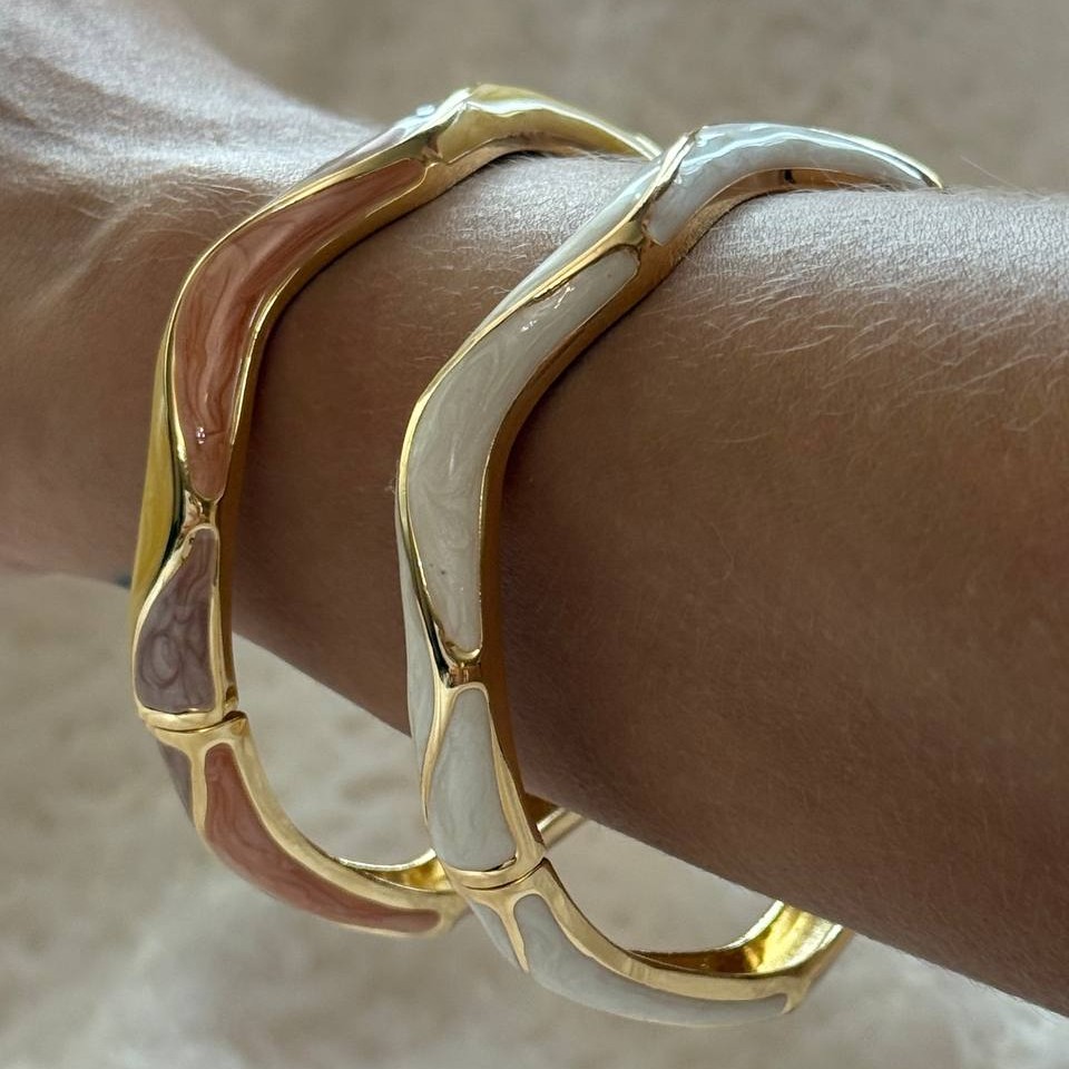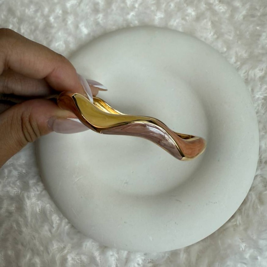 ✨ این دستبندهای مجسمهمانند با طراحی موجدار و لعاب براق، ترکیبی از رنگهای لطیف و جزئیات طلایی هستن که جلوهای هنری و مدرن به استایل شما میبخشن. رنگ صورتی با طلایی حس گرما و لطافت داره، در حالی که سفید با طلایی جلوهای کلاسیک و مینیمال ایجاد میکنه.