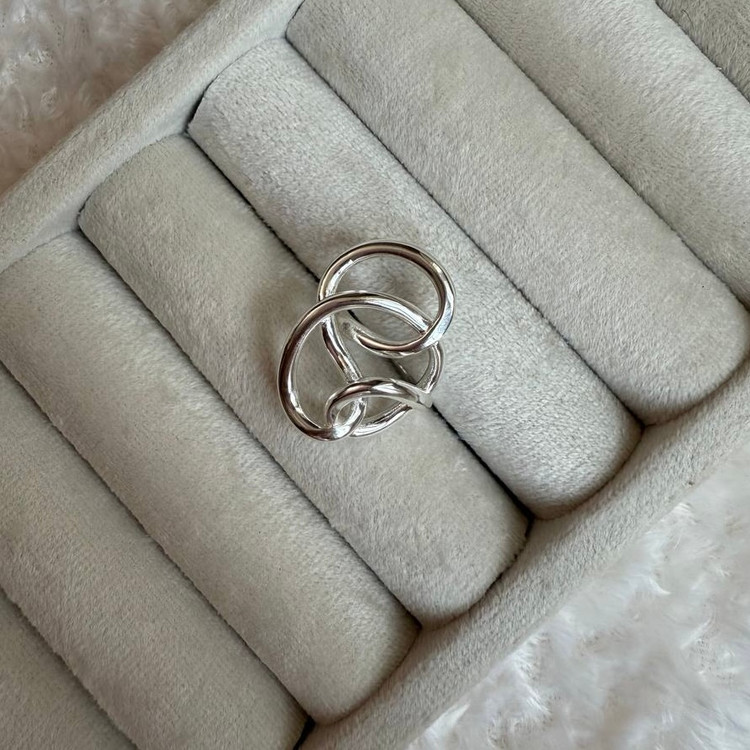 این انگشتر نقره ای با طراحی حلقه های متصل، یک قطعه زیبا و مدرن است که برای استفاده روزانه مناسب است.