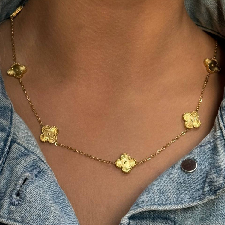 💫 این گردنبند با زنجیر ظریف و آویزهای گلمانند چهارپر، جلوهای زنانه و لطیف داره که با هر استایلی هماهنگ میشه. طراحی بافتدار گلها و نقطهی مرکزی هر آویز، حس هنری و خاص بودن رو منتقل میکنه.