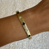 این دستبند با طراحی منحصربهفرد شامل ونکیلیف مشکی و نگینهای شفاف، جلوهای لوکس و خاص داره که در هر نور میدرخشه. بافت سطحی فلز و چینش دقیق جزئیات، نشوندهندهی کیفیت بالای ساخت و توجه به جزئیاته.