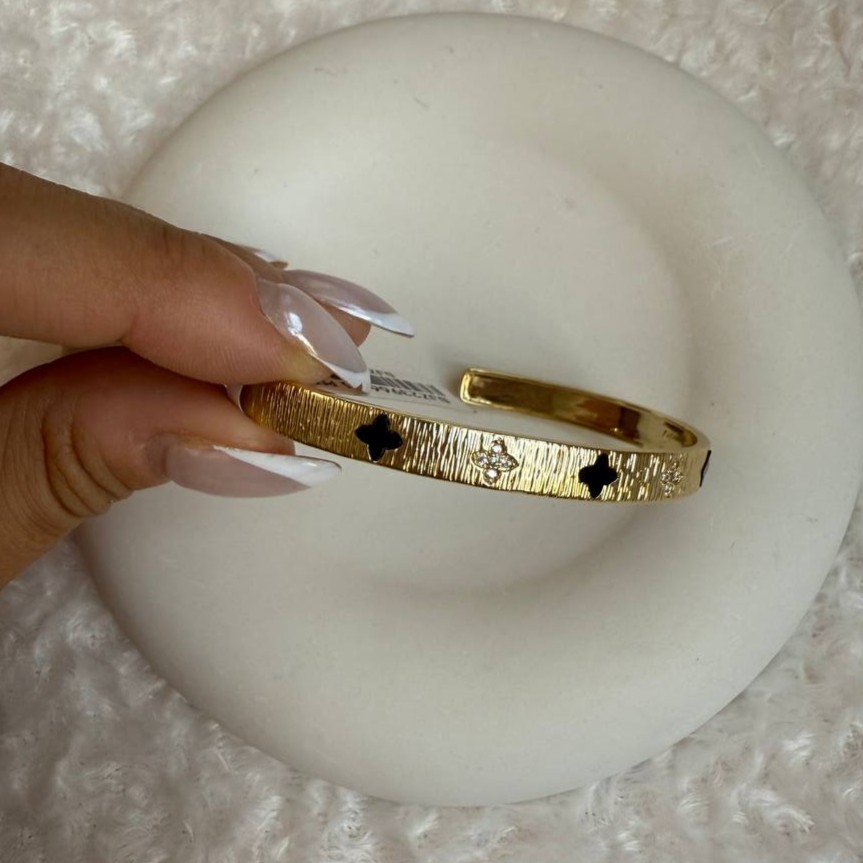 این دستبند با طراحی منحصربهفرد شامل ونکیلیف مشکی و نگینهای شفاف، جلوهای لوکس و خاص داره که در هر نور میدرخشه. بافت سطحی فلز و چینش دقیق جزئیات، نشوندهندهی کیفیت بالای ساخت و توجه به جزئیاته.