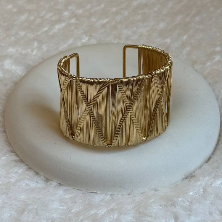 این بنگل با طراحی خاص از رشتههای فلزی طلایی که به صورت ضربدری و لایهلایه کنار هم قرار گرفتهاند، جلوهای معماریوار و مدرن دارد. بافت منظم و درخشان آن، حس قدرت، انسجام و زیبایی را به استایل شما اضافه میکند. مناسب برای کسانیست که به دنبال اکسسوریهای متفاوت، ساختارمند و چشمگیر هستند.