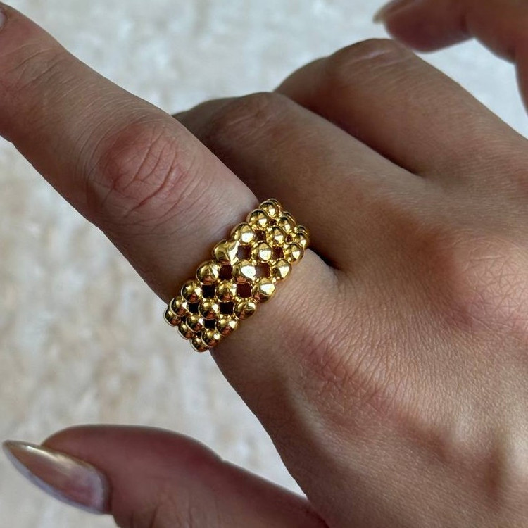 این انگشتر با طراحی چندردیفه از مهرههای طلایی کوچک، مثل بافتی مجلل و منظم روی انگشت شما میدرخشد. فرم برجسته و سطح بافتدار آن، حس شکوه، اصالت و جسارت زنانه را منتقل میکند. مناسب برای کسانیست که به دنبال یک قطعهی مستقل و چشمگیر هستند.