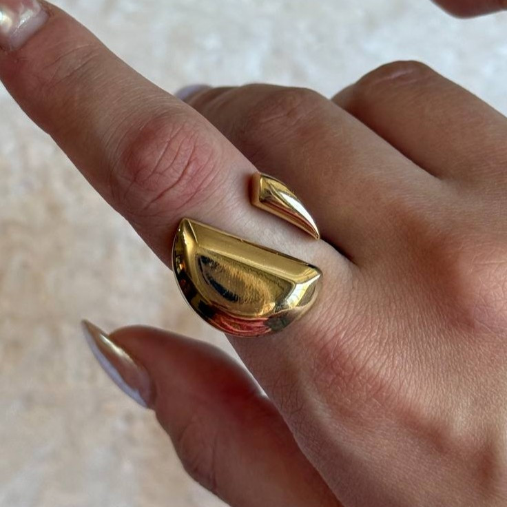 این انگشتر با طراحی باز و دو عنصر متضاد، جلوهای هنری و معاصر دارد. نیمدایرهی صیقلی در کنار فرم نوکتیز، حس تعادل، حرکت و قدرت زنانه را منتقل میکند. مناسب برای کسانیست که به دنبال یک قطعهی مستقل، خاص و متفاوت هستند.
