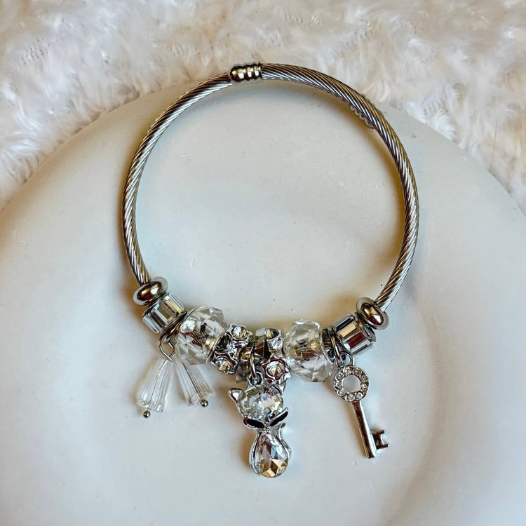 این دستبند با طراحی پیچخوردهی سیمی و آویزهای متنوع، ترکیبی از لطافت، خلاقیت و حس فصلی را به زیبایی منتقل میکند. آویزهایی مثل آدمبرفی کریستالی، کلید طلایی و مهرههای شفاف، هرکدام نمادی از خاطره، رمز و زیبایی هستند. مناسب برای کسانیست که به دنبال اکسسوریهایی با معنا و جلوهی خاص هستند.