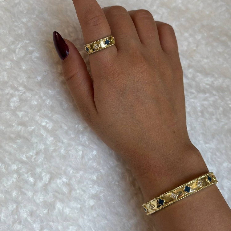 ست انگشتر و دستبند با شبدر مشکی – نماد ظرافت و خوششانسی در قاب طلایی