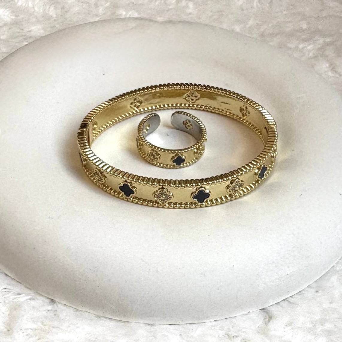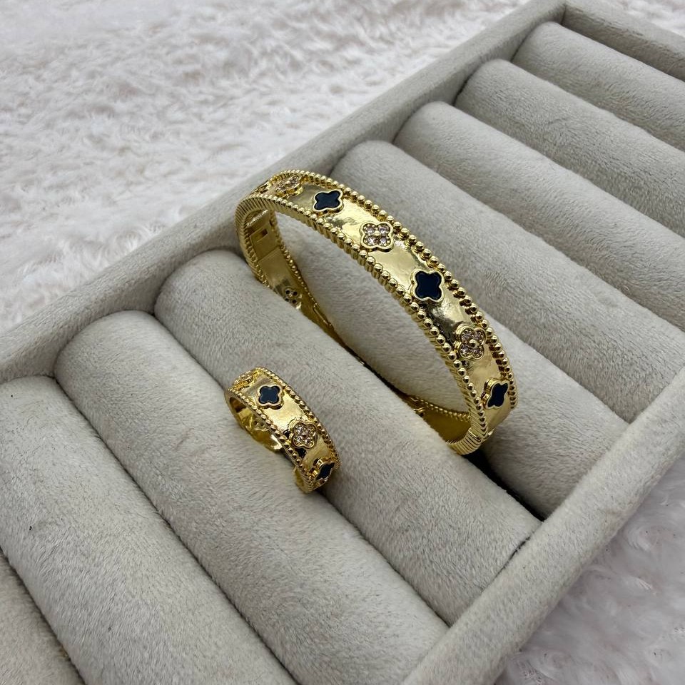 ست انگشتر و دستبند با شبدر مشکی – نماد ظرافت و خوششانسی در قاب طلایی