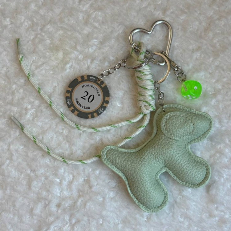 این آویز کیف با ترکیب المانهای سرگرمی و طراحی فانتزی، جلوهای خاص و پرانرژی دارد. شامل حلقهی قلبی فلزی، عروسک پشمالوی سبز، تاس شفاف، بند بافتدار و چیپ پوکر Monte Carlo، این مجموعه حس بازی، شانس و شخصیت مستقل را منتقل میکند.