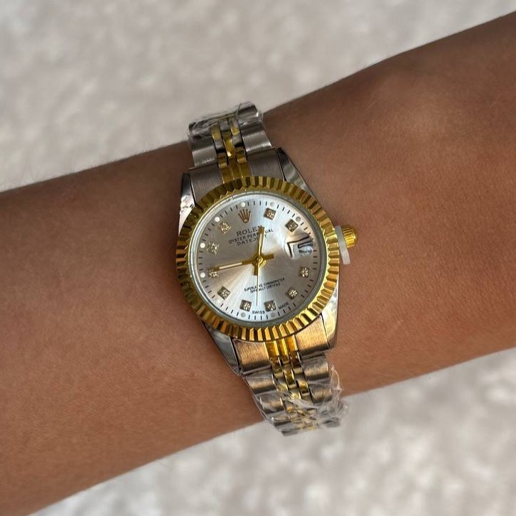 ساعت رولکس Datejust با طراحی دو رنگ نقرهای و طلایی، قاب فلوتشدهی طلایی و صفحهی نقرهای با نشانگرهای نگینی، ترکیبی از ظرافت کلاسیک و عملکرد بینقص را ارائه میدهد. لنز بزرگنمای تاریخ در موقعیت ساعت ۳ و لوگوی تاج رولکس در ساعت ۱۲، امضای طراحی این برند افسانهای هستند.