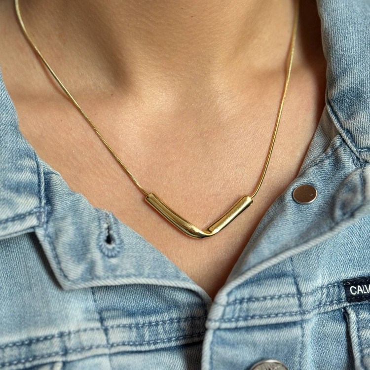 این گردنبند طلایی با آویز هندسی V شکل، ترکیبی از سادگی و استایل معاصر را ارائه میدهد. دو قطعهی استوانهای طلایی که با زاویه به هم متصل شدهاند، نمادی از تعادل و قدرت در طراحی هستند. این قطعه برای استایلهای مینیمال، روزمره یا رسمی با چاشنی مدرن بسیار مناسب است.