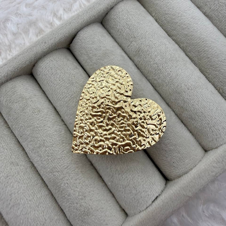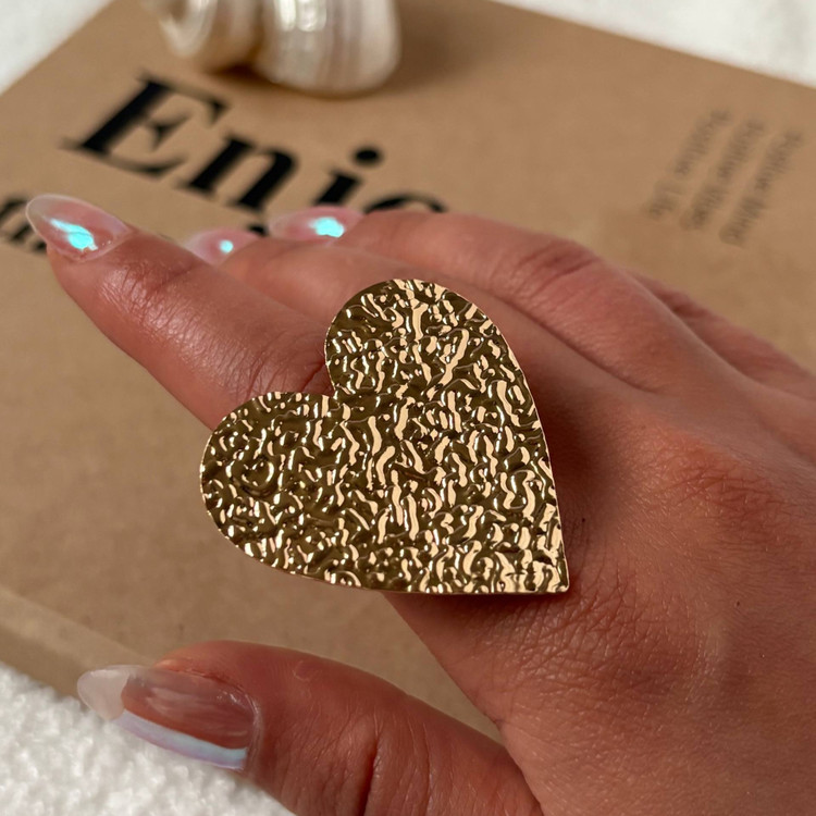 این انگشتر قلبی با طراحی بزرگ و بافت چکشی، جلوهای جسور، احساسی و هنری دارد. سطح نامنظم و برجستهی آن باعث بازتاب نور در زوایای مختلف میشود و حس عشق خام، قدرت زنانه و زیبایی مدرن را منتقل میکند. رنگ طلایی گرم در کنار فرم قلب، این قطعه را به انتخابی خاص برای استایلهای استیتمنت یا احساسی تبدیل کرده است.