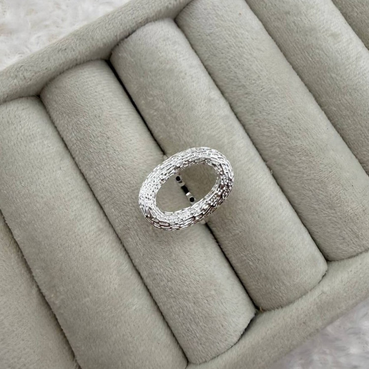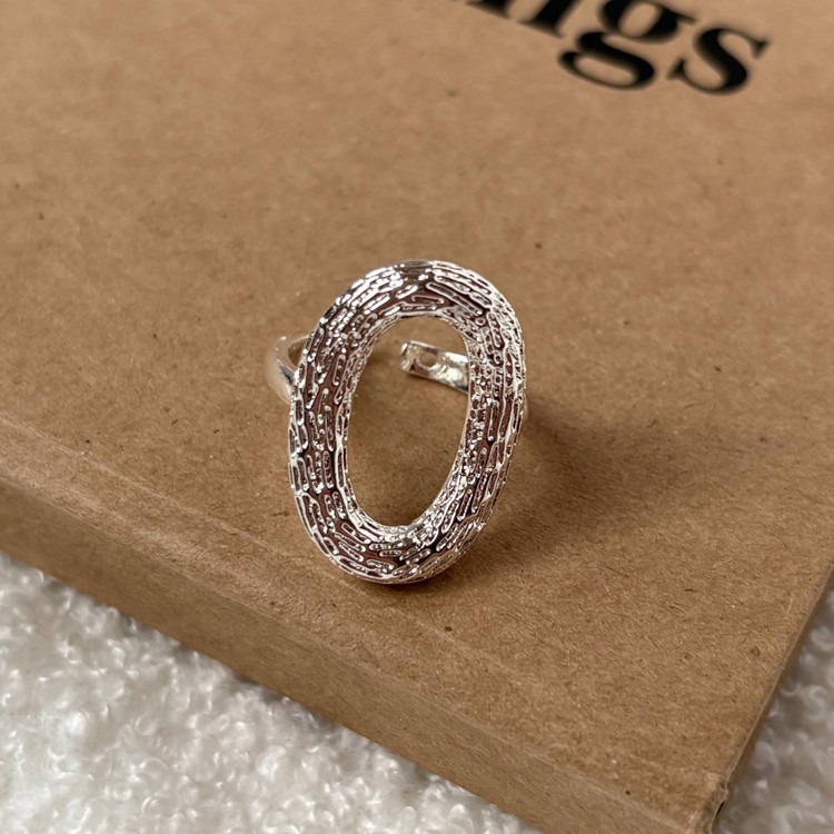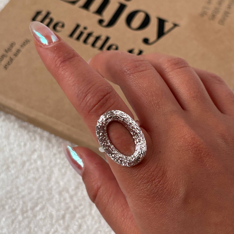 انگشتر بیضی نقرهای با بافت برجسته و مرکز توخالی – مجسمهای برای انگشتان شما