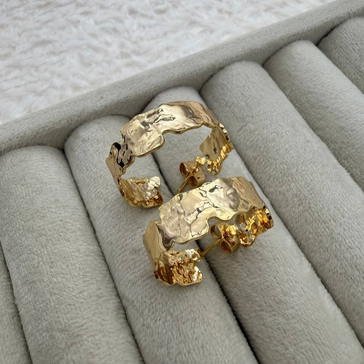 این گوشوارهها با فرم نامنظم و بافت چکشی، جلوهای طبیعی، هنری و استیتمنت دارند. طراحی آنها یادآور فلز مذاب یا سنگتراشی دستساز است—نمادی از اصالت، قدرت و زیبایی غیرقابلتکرار. رنگ طلایی گرم و سطح نیمهمات، حس لوکس و خاص بودن را تقویت میکند. مناسب برای استایلهای مینیمال، مفهومی یا فشن جسور.