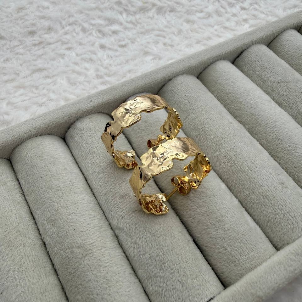 این گوشوارهها با فرم نامنظم و بافت چکشی، جلوهای طبیعی، هنری و استیتمنت دارند. طراحی آنها یادآور فلز مذاب یا سنگتراشی دستساز است—نمادی از اصالت، قدرت و زیبایی غیرقابلتکرار. رنگ طلایی گرم و سطح نیمهمات، حس لوکس و خاص بودن را تقویت میکند. مناسب برای استایلهای مینیمال، مفهومی یا فشن جسور.