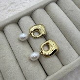 گوشواره طلایی با طراحی هندسی و مروارید اشکی – تضاد لطافت و جسارت در قاب هنری