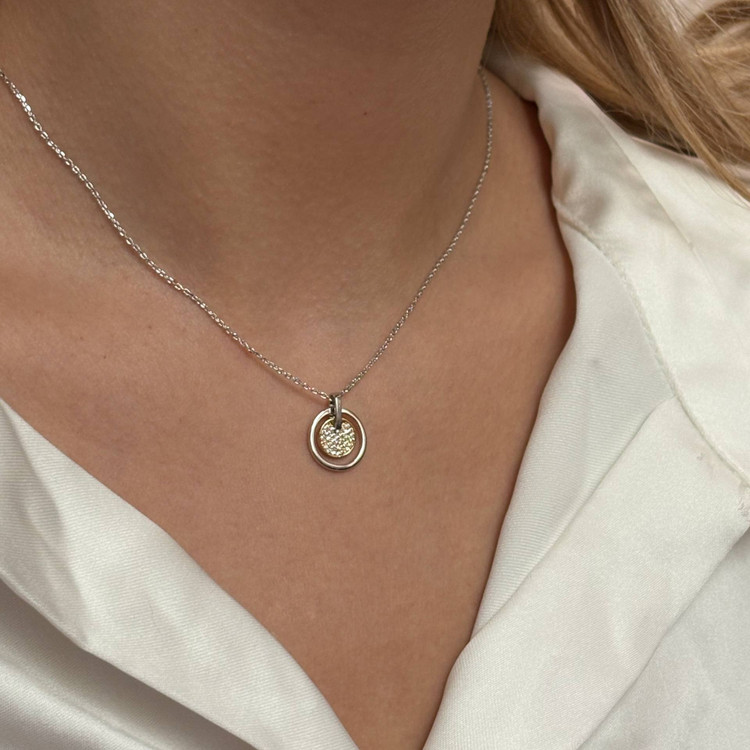 گردنبند نقرهای با آویز دایرهای نگیندار – مینیمالیسم درخشان در قاب مدرن