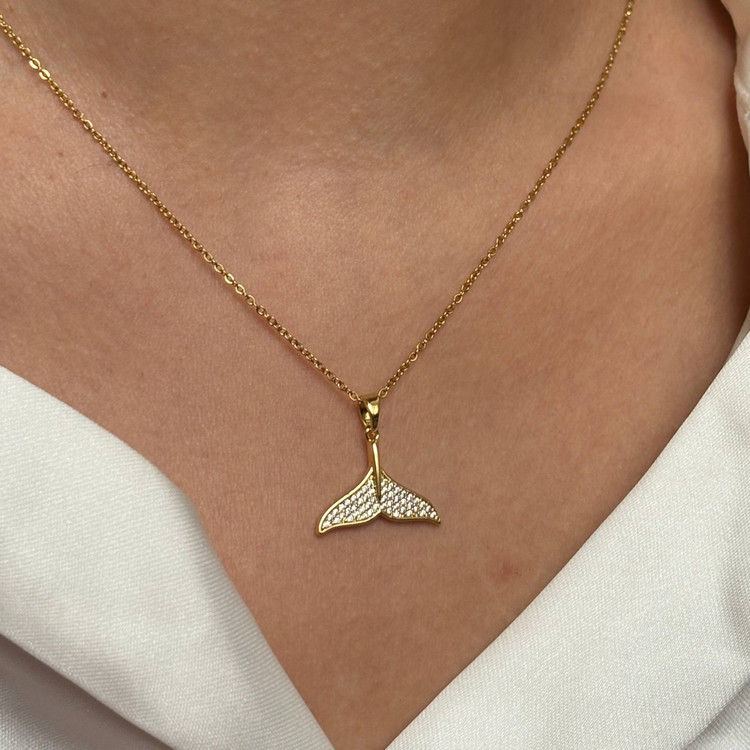 این گردنبند با زنجیر طلایی ظریف و آویز دم نهنگ نگیندار، ترکیبی از نماد طبیعت و طراحی مدرن را ارائه میدهد. دم نهنگ، نمادی از آزادی، حرکت و قدرت درونیست، و نگینهای ظریف، جلوهای زنانه و مجلسی به آن میبخشند. مناسب برای استایلهای تابستانی، عاشقانه یا هدیههای خاص.