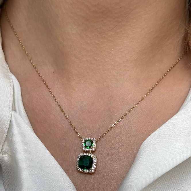این گردنبند با زنجیر طلایی ظریف و آویز دو نگین سبز مربعی، ترکیبی از طراحی کلاسیک و الهام از طبیعت است. نگینهای سبز با قاب الماسی، نمادی از آرامش و انرژی مثبت بوده و جلوهای زنانه و مجلسی به استایل شما میبخشند. مناسب برای مهمانیها، قرارهای عاشقانه یا هدیهای خاص و ماندگار.