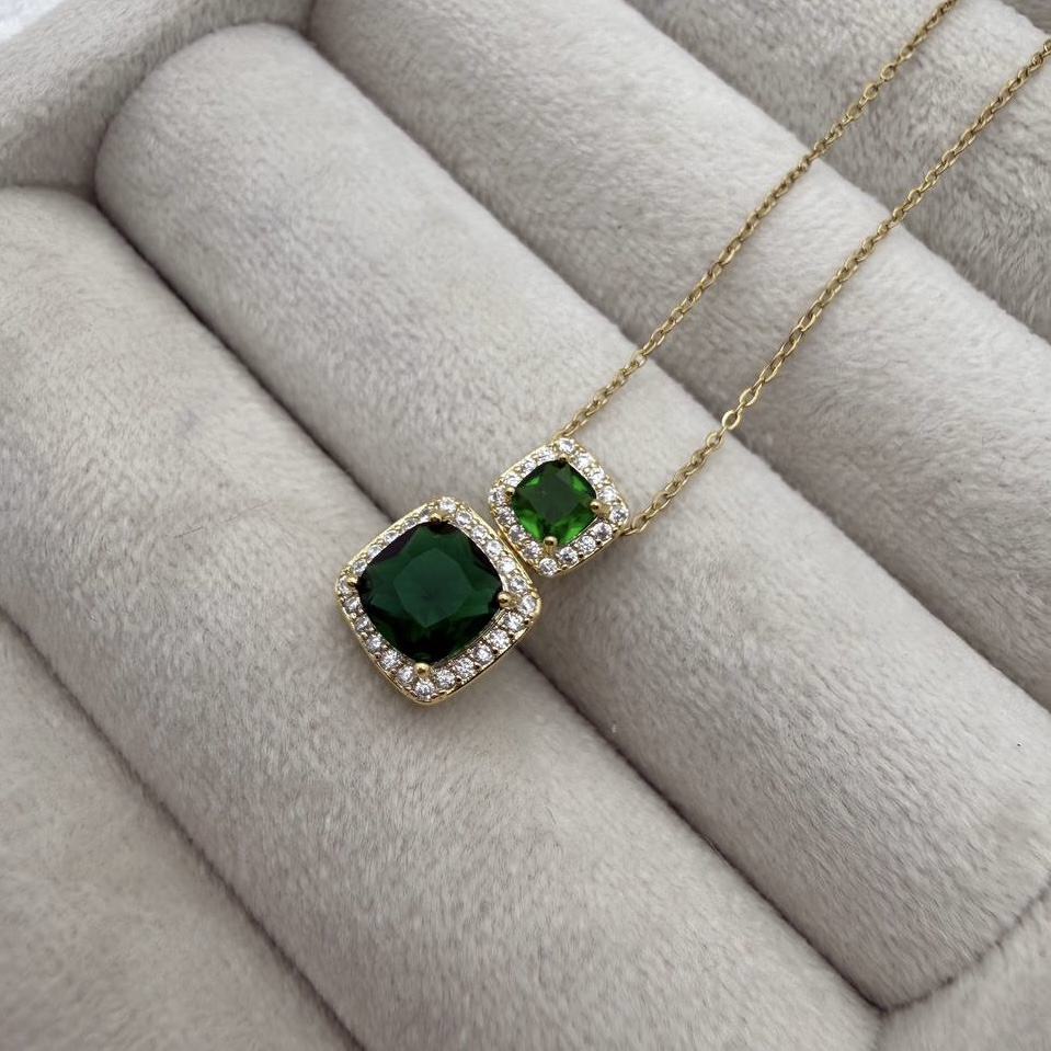 این گردنبند با زنجیر طلایی ظریف و آویز دو نگین سبز مربعی، ترکیبی از طراحی کلاسیک و الهام از طبیعت است. نگینهای سبز با قاب الماسی، نمادی از آرامش و انرژی مثبت بوده و جلوهای زنانه و مجلسی به استایل شما میبخشند. مناسب برای مهمانیها، قرارهای عاشقانه یا هدیهای خاص و ماندگار.