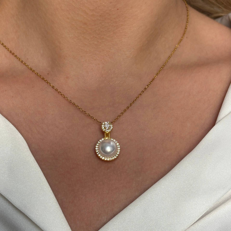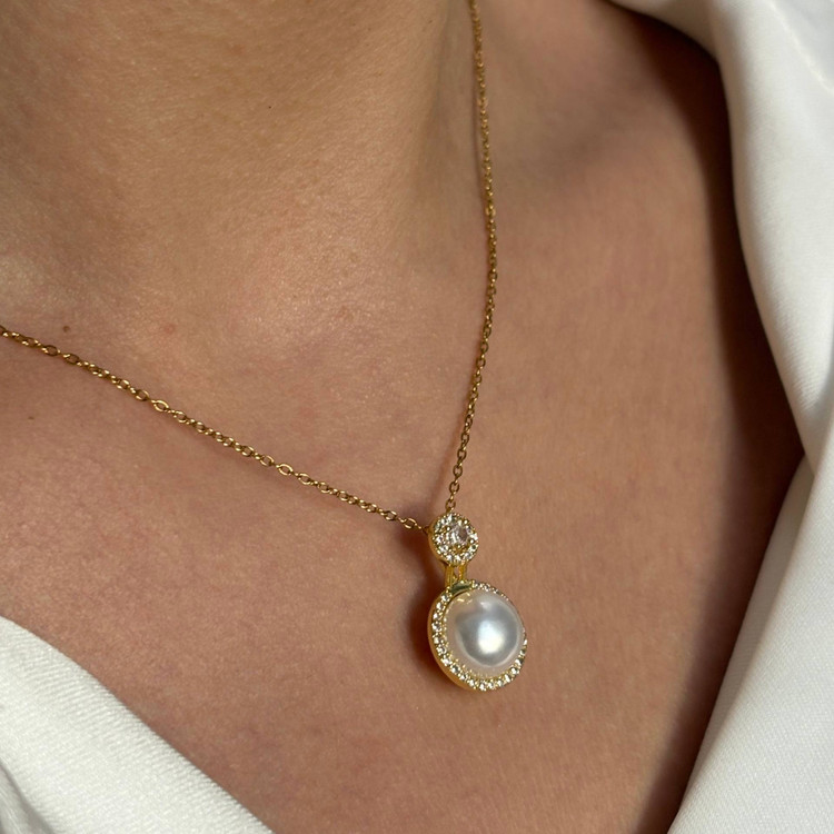 این گردنبند با زنجیر طلایی ظریف و آویز مرواریدی دایرهای، ترکیبی از طراحی کلاسیک و جلوهای لوکس است. مروارید سفید مرکزی با قاب نگیندار و اتصال نگیندار بالایی، نمادی از لطافت، وقار و زیبایی زنانه بوده و جلوهای خاص و مجلسی به استایل شما میبخشد. مناسب برای مهمانیهای رسمی، مناسبتهای خاص یا هدیهای ماندگار برای کسی که دوستش دارید.