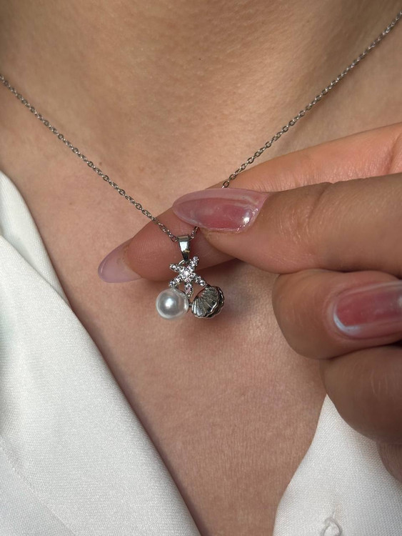 گردنبند با آویز صدف، مروارید و ستاره – هماهنگی آسمان و دریا در دو رنگ خاص